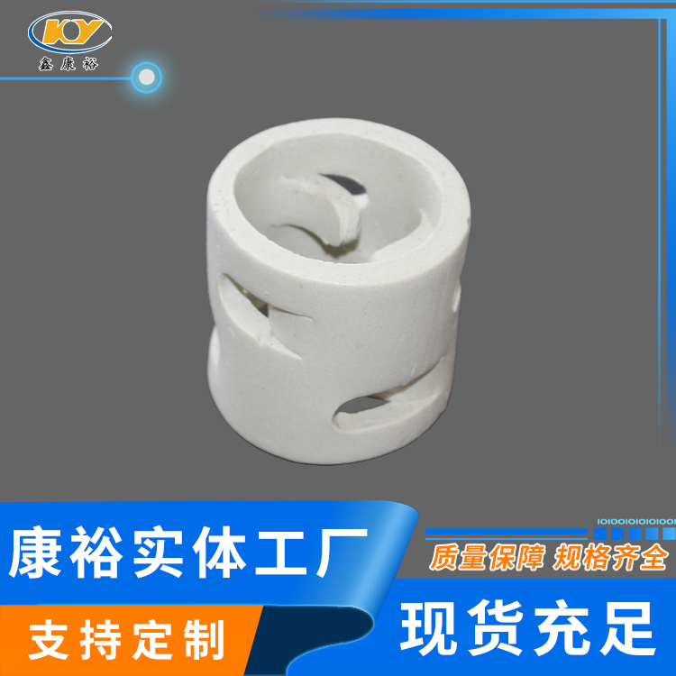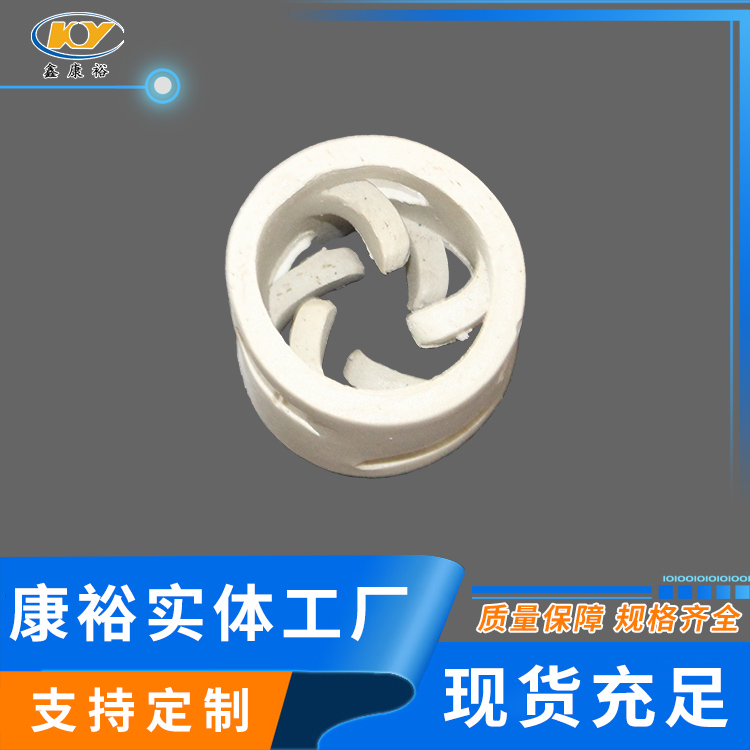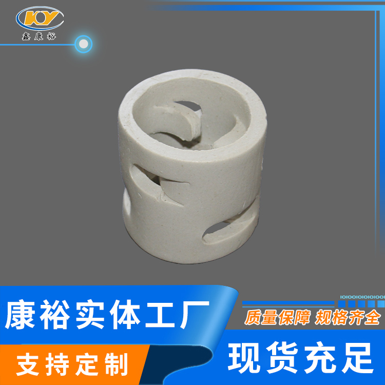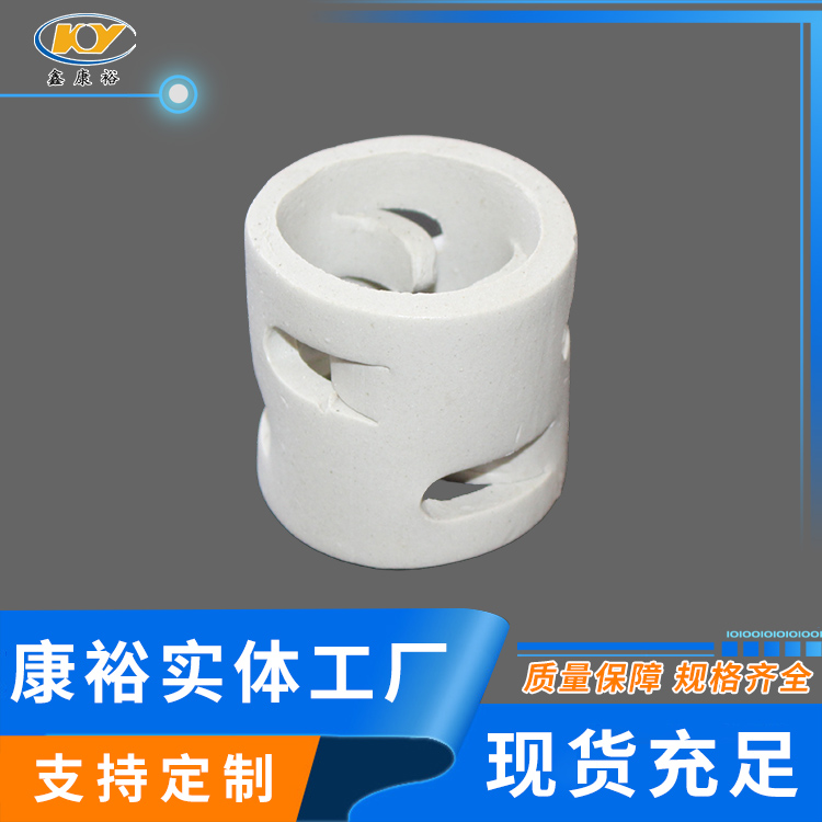 康裕陶瓷鮑爾環(huán)填料是一種高徑相等的開孔環(huán)型填料,每層窗孔有5個舌葉,每個舌葉內(nèi)彎指向環(huán)心,上下兩層窗孔的位置相反錯開,一般開孔面積約占環(huán)壁總面積的30%左右。