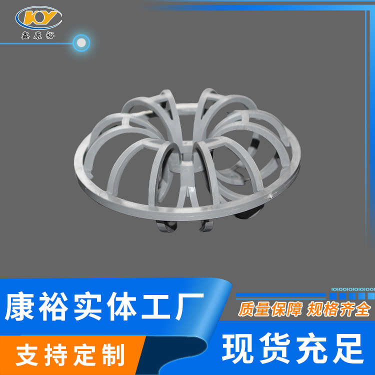 塑料花環(huán)填料早是由美國A.J.Teller于1954年研制開發(fā)出來的,故而常稱之為泰勒花環(huán)(TellerRosette)。由于填料的空隙處能有較高的持液量,可使塔內(nèi)液體的停留時間較長,從而增加了氣液兩相的接觸時間,提高了填料的傳質(zhì)效率?!』ōh(huán)填料也稱梅花環(huán)填料塑料花環(huán)填料是由12個小圓環(huán)按徑向排列而組成的一個大扁球體,很類似于一個螺旋形彈簧首尾相接繞成的一個圓球體。有的小圓呈A字;有的在小圓和大圓邊沿還帶有齒;有的外圍沒有大圓圈,只有里面的小圓組成等,客戶可根據(jù)各自的要求訂購不同種類的花環(huán)。